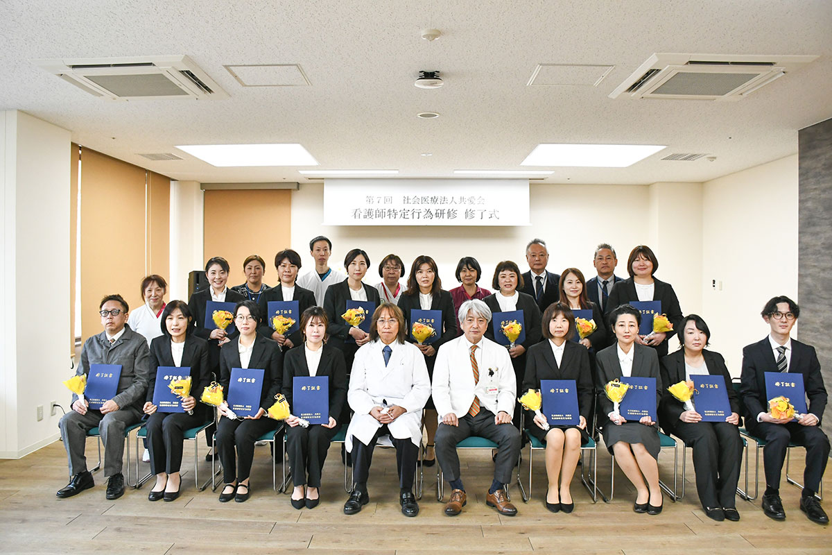 令和7年3月1日に修了式を開催しました。「在宅・慢性期領域」1名、「術中麻酔管理領域」2名と区分別科目「栄養に係るカテーテル管理関連」、「創傷管理関連」、「動脈血液ガス分析関連」、「透析管理関連」、「栄養及び水分管理に係る薬剤投与関連」をそれぞれ選択した研修生16名が修了証書を授与されました。宗宏伸統括副院長より励ましのお言葉を頂戴し素晴らしい式典となりました。これから、手順書のもと看護師特定行為の実践となります。看護師特定行為研修室としても修了生が活躍できるよう支援を続けていきたいと思います。修了生の今後の活躍に期待しています。