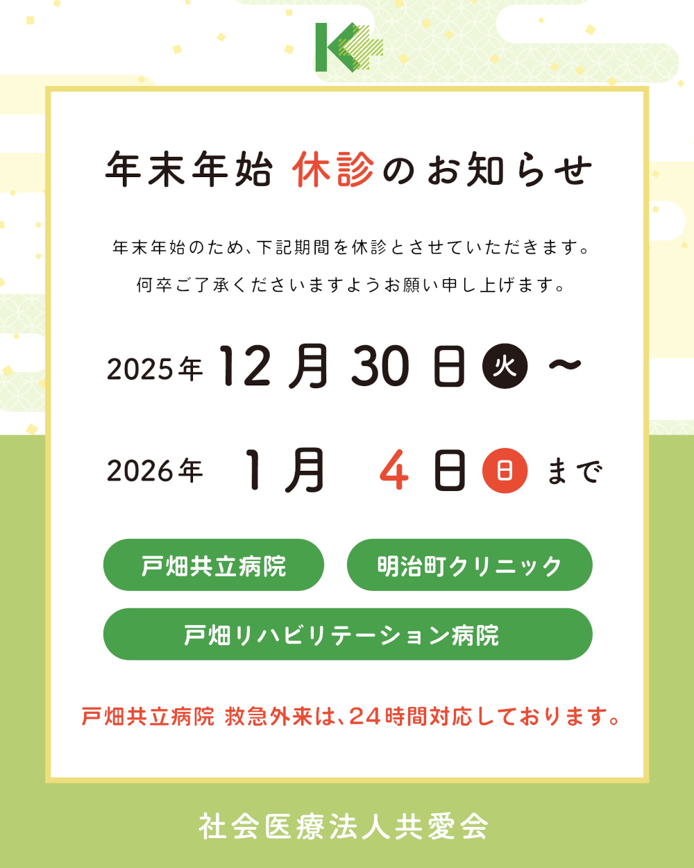 戸畑共立病院、戸畑リハビリテーション病院、明治町クリニックでは、年末年始のため、下記期間を休診とさせていただきます。 【休診日】 2025年12月30日(火) 〜 2026年1月4日(日)まで ※戸畑共立病院は24時間体制で救急外来を受け入れております。 何卒ご了承くださいますようお願い申し上げます。 社会医療法人共愛会