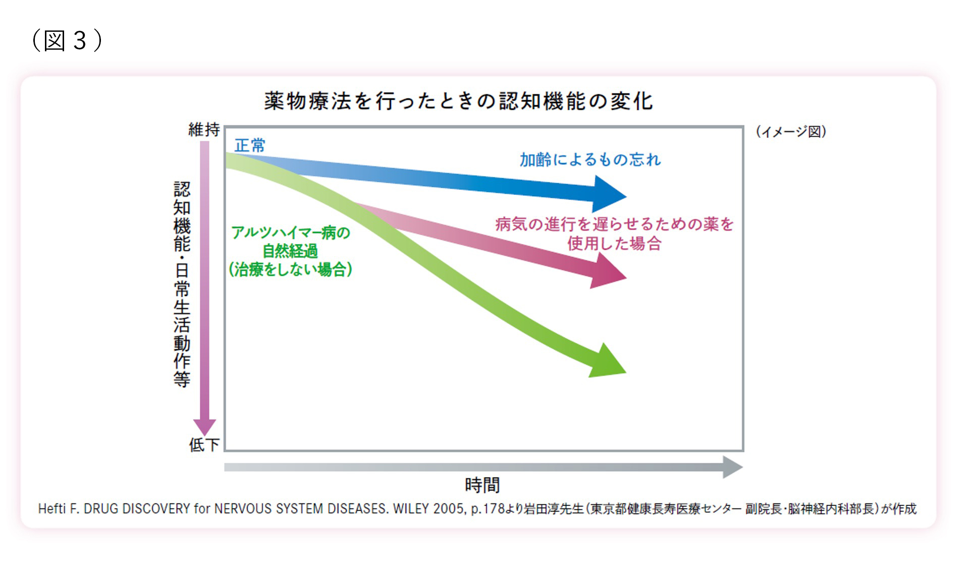 アルツハイマー病はアミロイドβと呼ばれる蛋白質が脳内へ異常に蓄積して引き起こされると考えられています(図1)。レカネマブ(レケンビ®)の薬物療法により脳へのアミロイドβ蓄積を減少させ(図2)、病状の進行を遅らせることが期待されます(図3)。