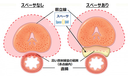 また、当院では前立腺癌治療の際に直腸への副作用を低減させるためにSpaceOARの留置を行っております。これは前立腺と直腸の間に間隔を作る事で直腸に当たる線量を下げることができます。