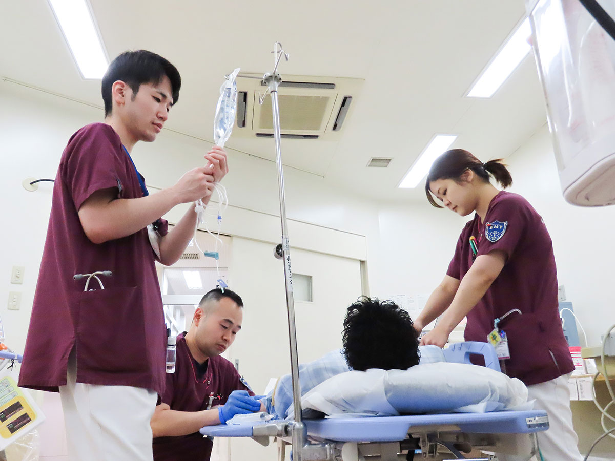 救急告示・地域支援病院として365日24時間体制で救急患者を積極的に受け入れています。看護師の他に救急救命士も所属しており、コメディカルと連携し、安全で質の高い救急医療の充実を図っています。患者の疾患や症状は多岐にわたり、高度な専門性と幅広い知識、技術が求められるため、医師を交えた症例検討や学習、緊急度判定トレーニング等を行っています。また、近隣の消防機関と連携を図りメディカルコントロールや、救急救命士の病院実習での再教育などを行い、地域の救急医療強化に努めています。