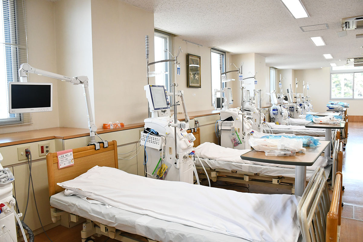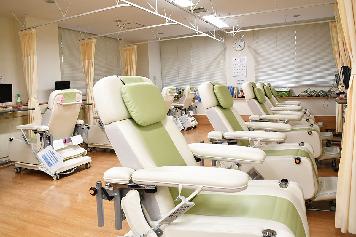 外来維持透析の方をはじめ、他科の治療目的での入院透析、臨時の旅行透析も随時受け入れています。人工透析とは腎炎、高血圧、糖尿病などにより腎臓が機能しなくなった人に対して腎臓の代わりに機械を使用し血液中の老廃物の除去や水分を取り除く治療です。
