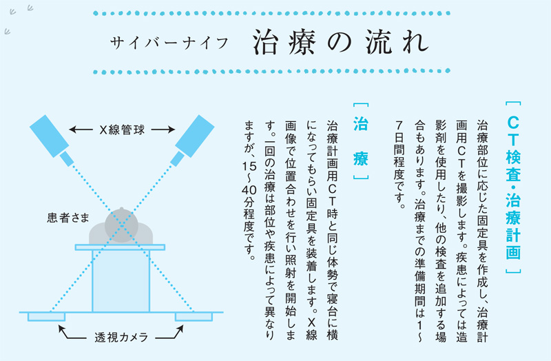 サイバーナイフは天井にある二つのX線撮影装置で得られる画像をもとに位置合わせを行います。認識された位置ずれは6軸の関節を持つロボカウチと呼ばれる寝台と照射装置のついたロボットアームにより補正されます。照射中も一定間隔でX線画像を撮影しながら補正計算を行いロボットアームが調整しながら照射を進めていきます。これらにより正確な位置合わせと補正が可能となり、高度なピンポイント照射を行います。